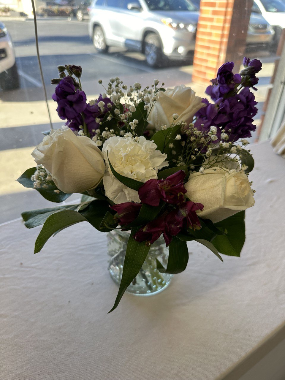 White roses symbolize purity, new beginnings, and remembrance, while white carnations represent love and admiration. Purple stock flowers signify beauty, strength, and a lasting bond, while baby's breath is associated with everlasting love and innocence. Dark purple alstroemeria (Peruvian lily) symbolizes friendship, devotion, and mutual support.