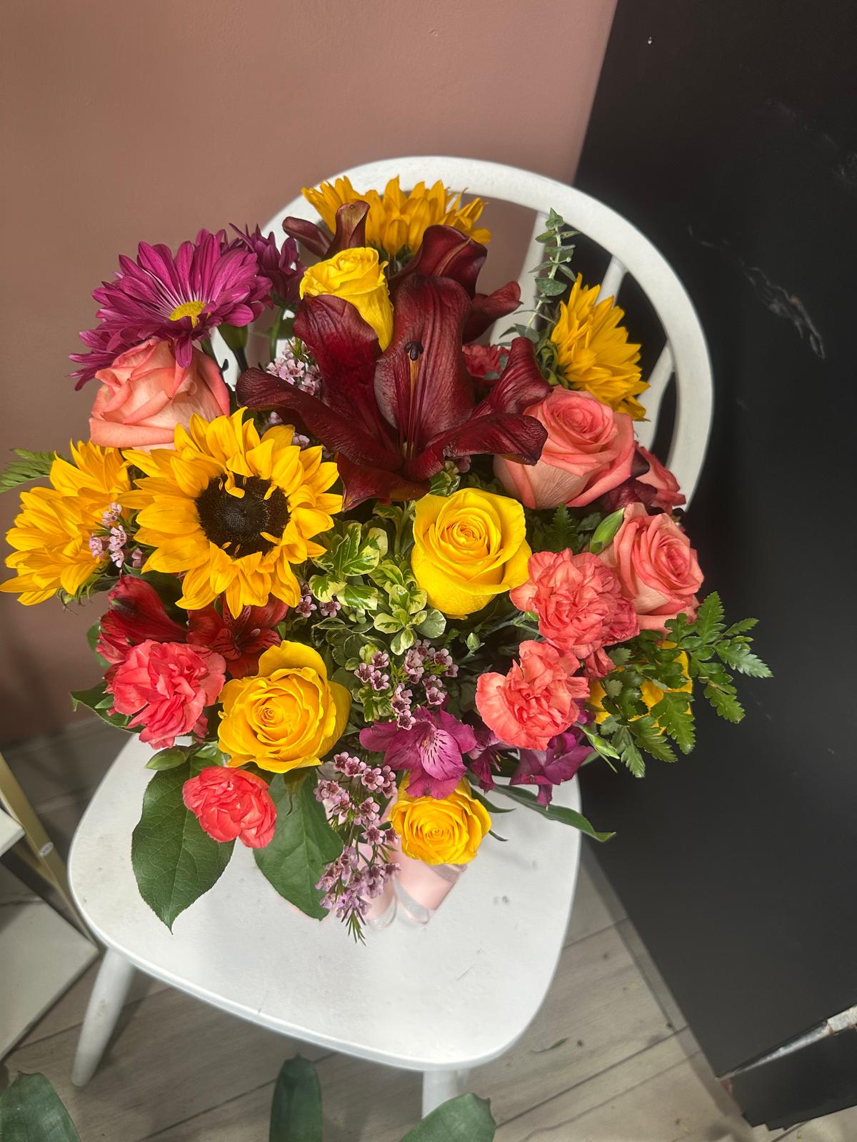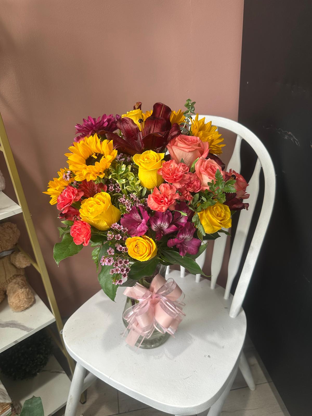 A bold celebration of color and texture — this arrangement fuses sunflowers, yellow and coral roses, lilies, and dainty accent blooms in a glass vase with a double-layered pastel bow. A statement piece for any room or occasion that deserves extra sparkle.