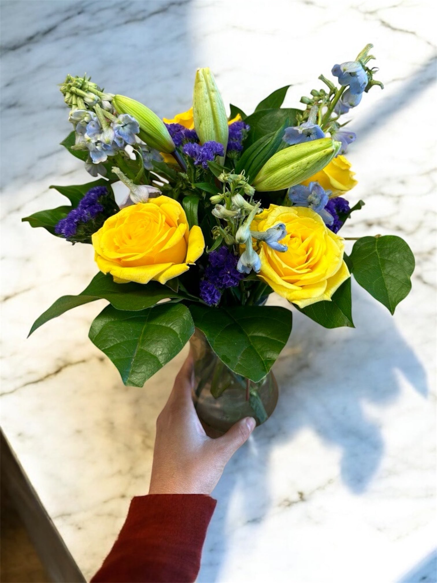 A radiant blend of sunny yellow roses and delicate blue accents, symbolizing joy and tranquility. Finished with lush greenery, this arrangement exudes warmth and elegance.