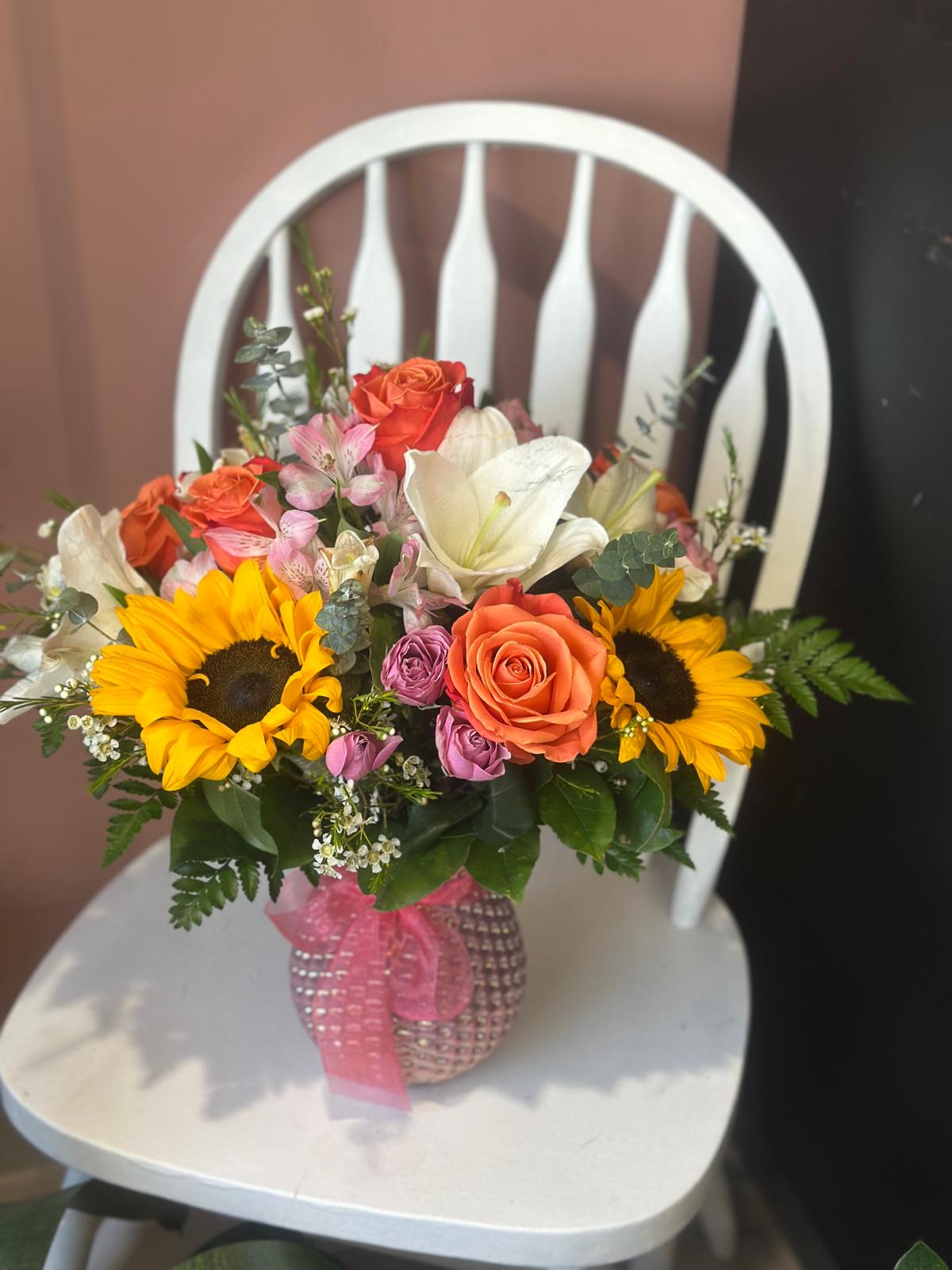 Bursting with warmth and cheer, this vibrant arrangement features golden sunflowers, coral roses, white lilies, and delicate pink alstroemeria. Arranged in a textured vase with a soft pink bow, it's perfect for brightening any room or gifting heartfelt joy.