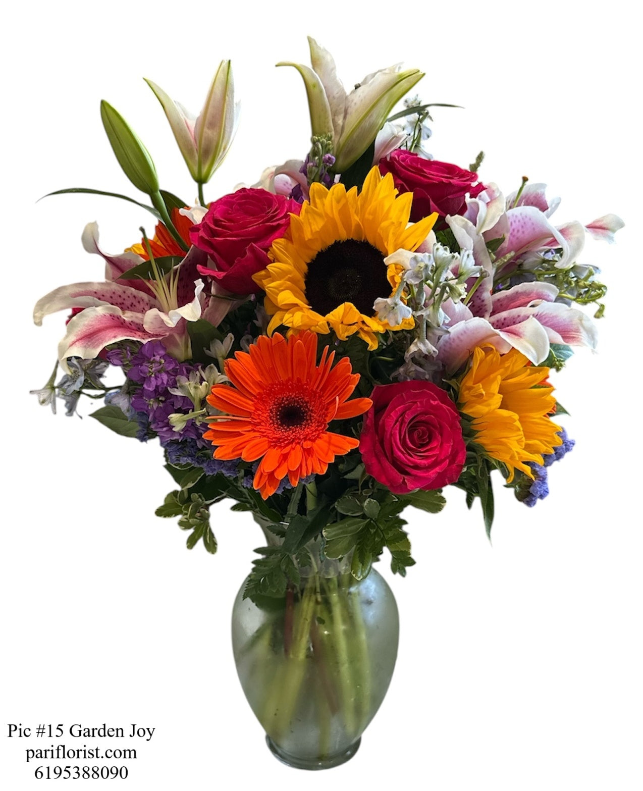 Bright and uplifting, Garden Joy bursts with color and charm. This lively mix features golden sunflowers, bold orange gerbera daisies, radiant roses, and fragrant stargazer lilies accented with soft seasonal blooms. Arranged in a classic glass vase, it’s the perfect choice for birthdays, get-well wishes, or simply bringing a smile to someone’s day.