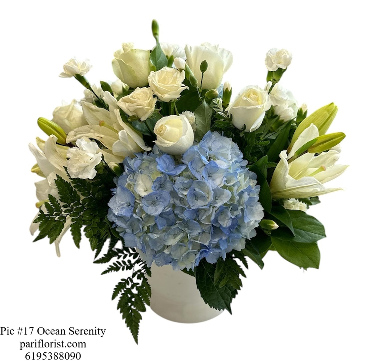 Calm and graceful, Ocean Serenity features lush white roses, lilies, and carnations surrounding a stunning cluster of soft blue hydrangea. Accented with rich greenery and arranged in a classic vase, this bouquet evokes peace, purity, and gentle beauty. Perfect for sympathy gestures, weddings, or as a sophisticated gift to bring comfort and tranquility.