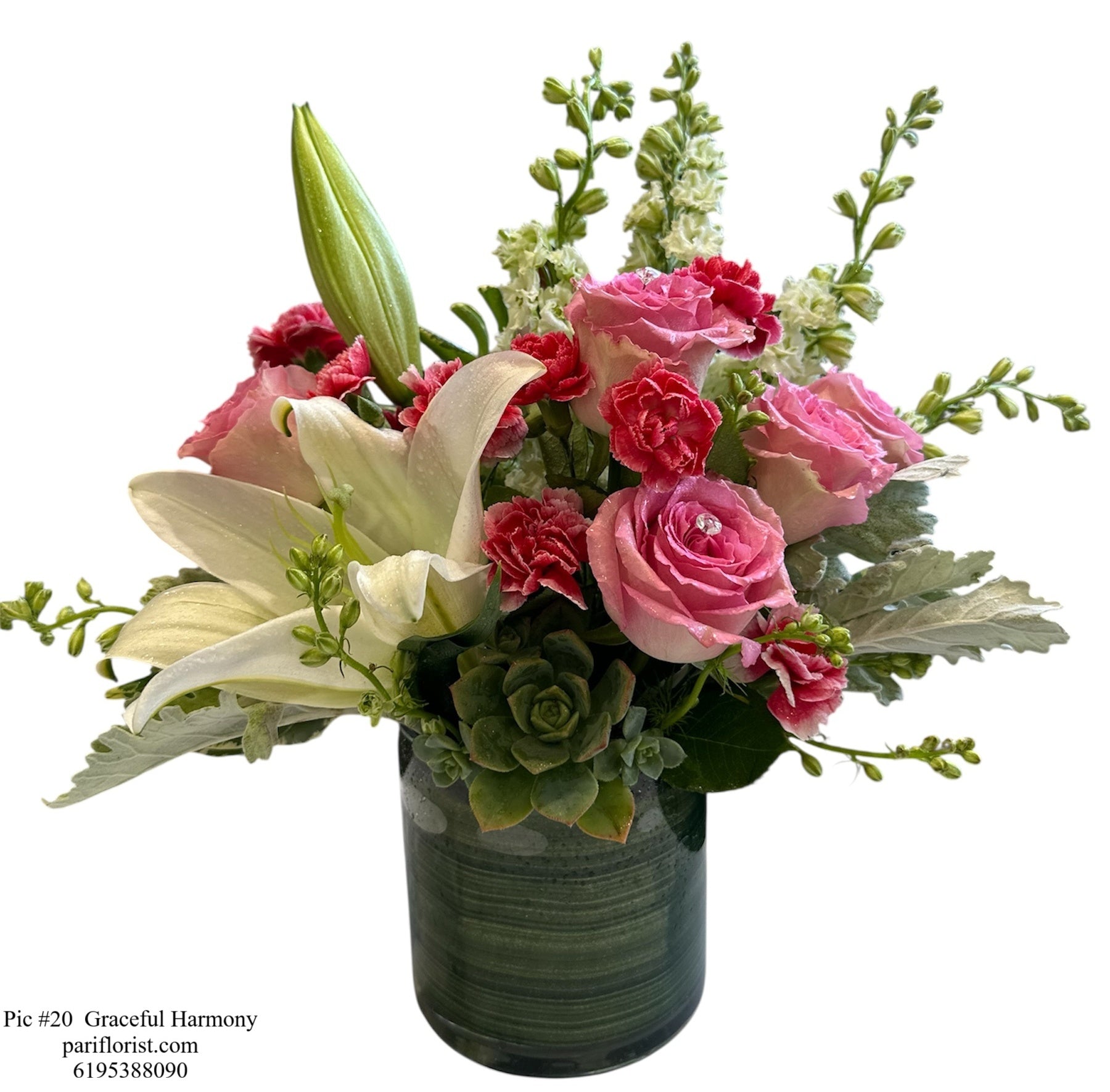 Soft yet striking, Graceful Harmony blends the elegance of creamy white lilies with the charm of pink roses and carnations, accented by fresh greenery and a touch of succulents for modern texture. Designed in a sleek green vase, this bouquet is a beautiful balance of romance and sophistication—perfect for birthdays, anniversaries, or simply sending warm thoughts.
