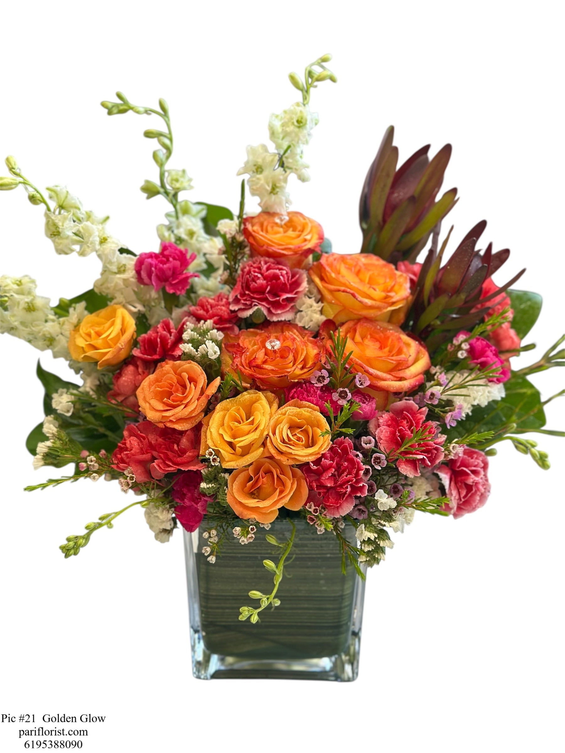 Bursting with energy and color, Golden Glow features radiant orange and yellow roses, cheerful pink carnations, delicate wax flowers, and fresh seasonal accents. Designed in a modern glass vase, this bright and joyful bouquet is perfect for birthdays, celebrations, or simply sending happiness and warmth to brighten someone’s day.