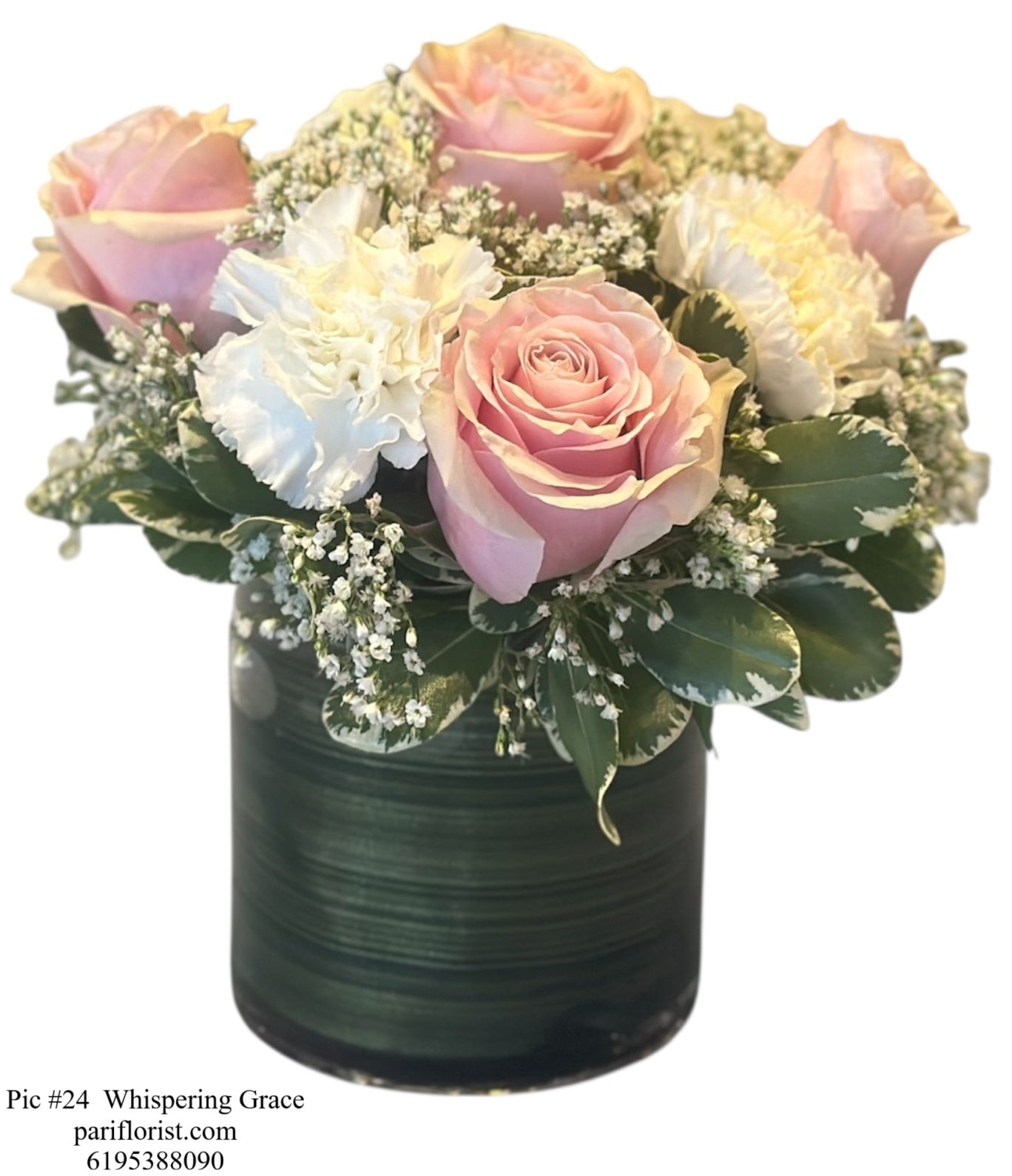 Delicate and timeless, Whispering Grace features blush pink roses paired with pure white carnations and airy baby’s breath, accented by fresh greenery. Arranged in a chic green vase, this bouquet is the perfect balance of sweetness and sophistication. Ideal for anniversaries, sympathy gestures, or simply sharing a quiet message of love and care.