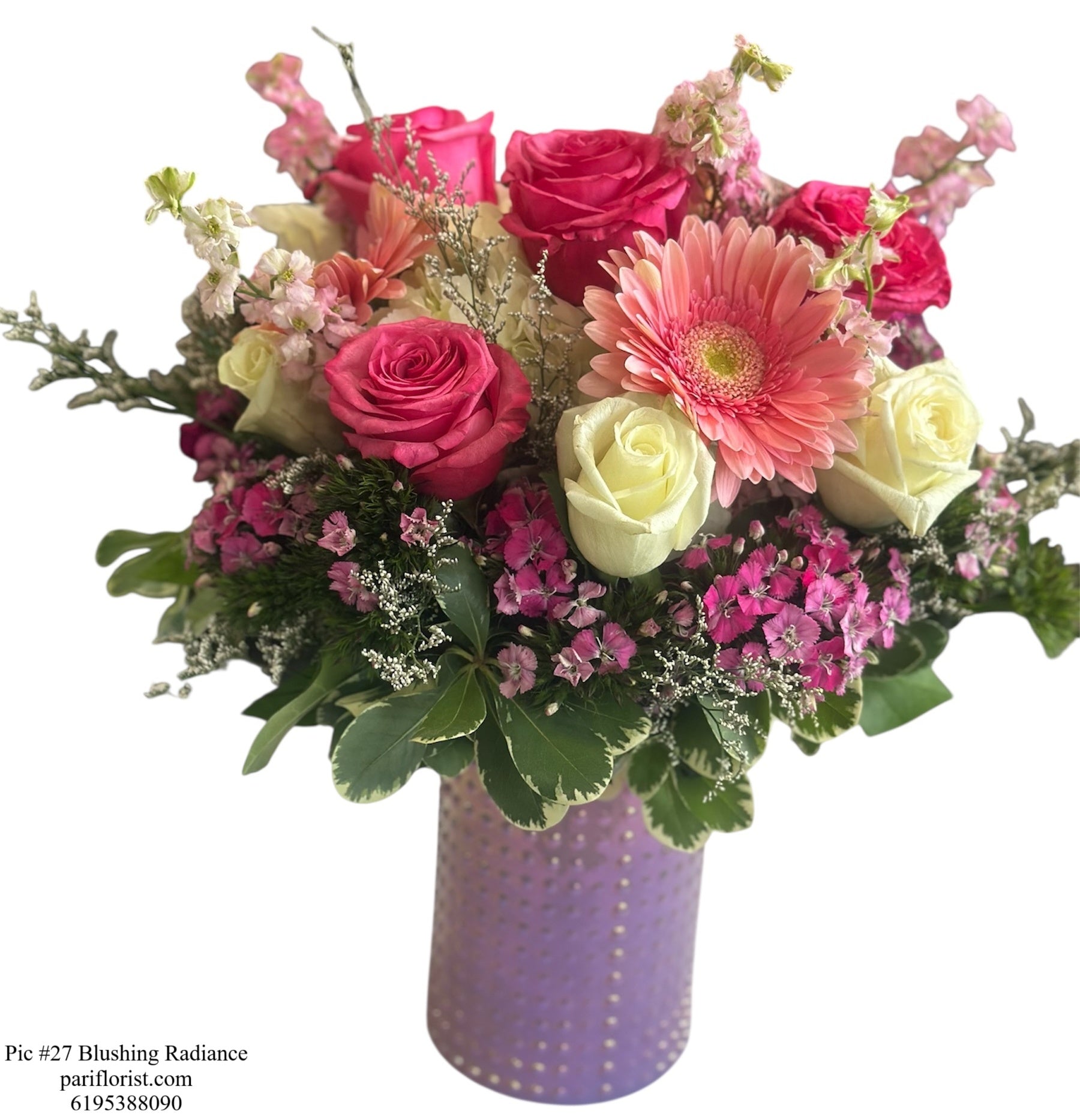 Bright and full of charm, Blushing Radiance features a gorgeous mix of hot pink roses, creamy white roses, cheerful gerbera daisies, and soft seasonal blooms. Arranged in a chic lavender-toned vase, this bouquet is the perfect balance of elegance and playfulness. Ideal for birthdays, anniversaries, or simply bringing joy and beauty to someone’s day.