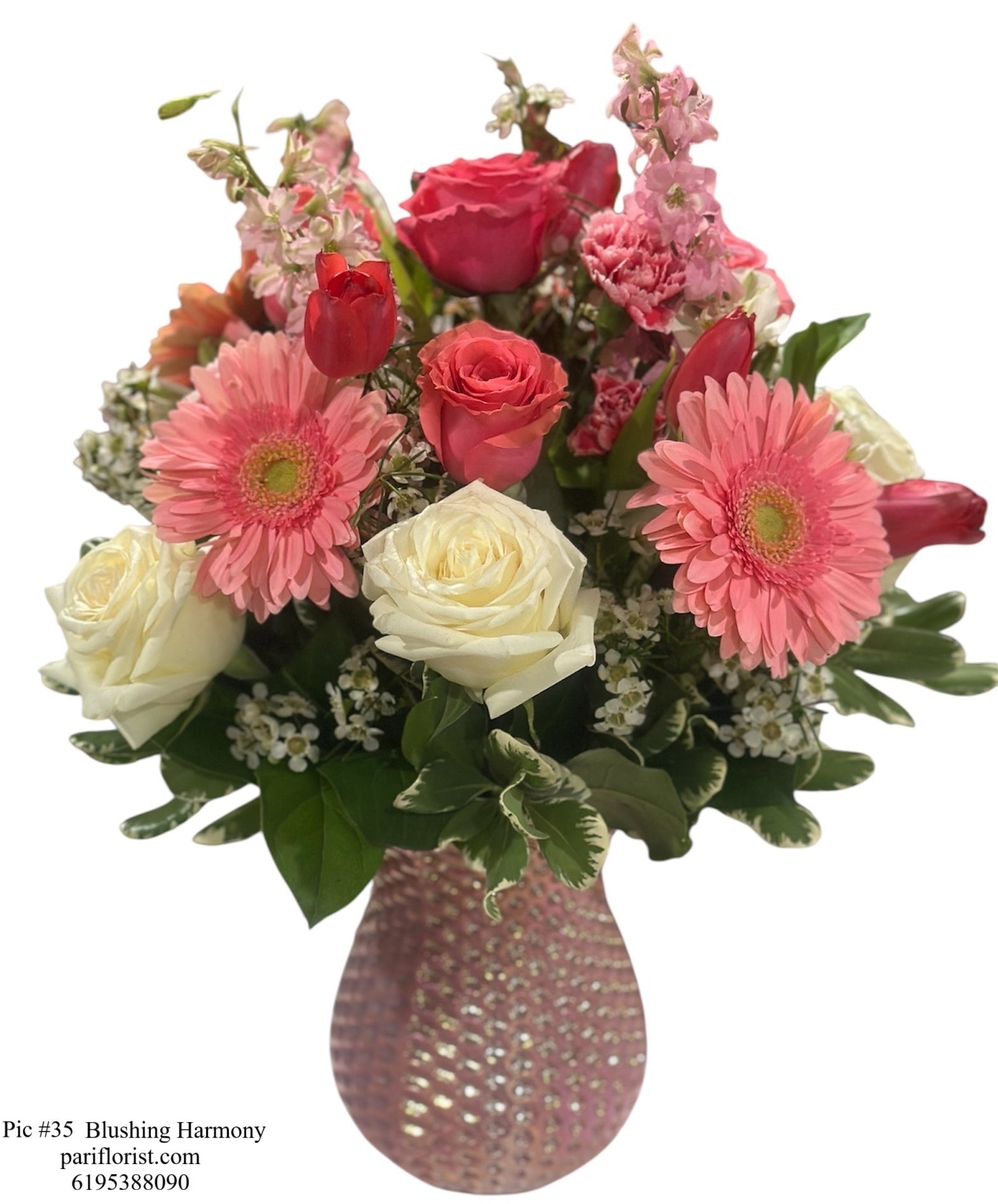 Soft, romantic, and full of charm, Blushing Elegance combines delicate pink gerbera daisies, vibrant roses, pure white blooms, and accents of fresh greenery. Arranged in a shimmering pink textured vase, this bouquet radiates beauty and grace, making it the perfect gift for birthdays, anniversaries, or simply letting someone know they’re cherished.