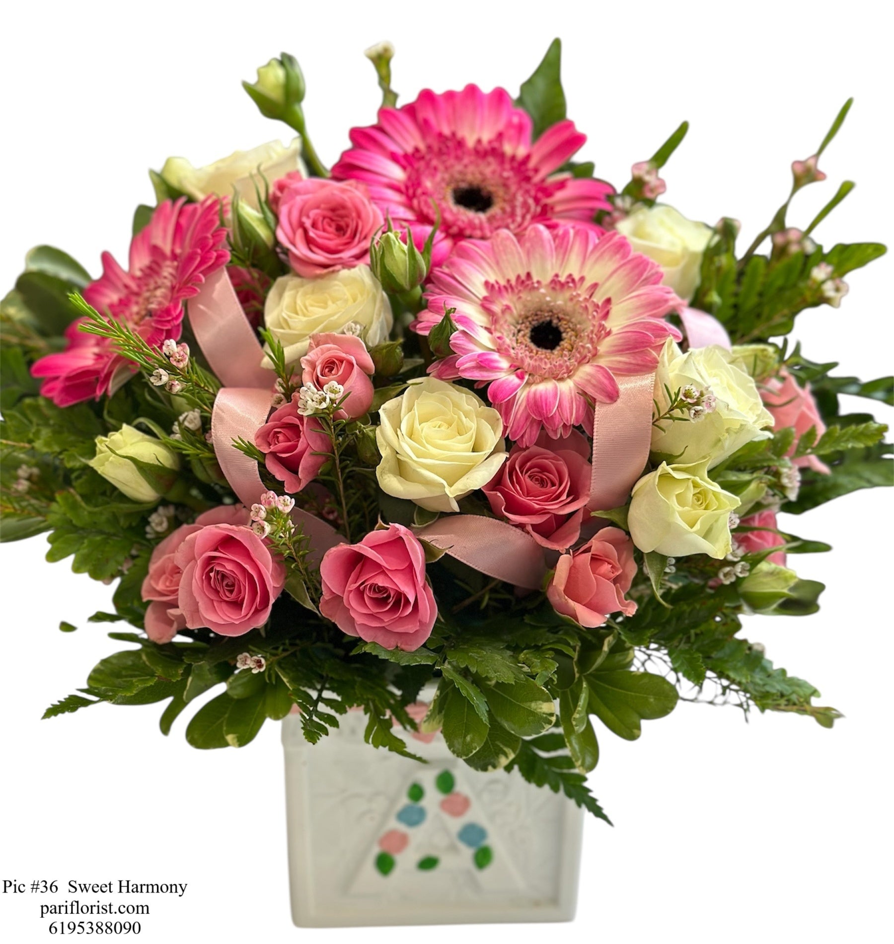 Delicate yet vibrant, Sweet Harmony brings together cheerful pink gerbera daisies, soft ivory roses, and lush greenery, tied together with a charming pink ribbon. Arranged in a white decorative vase, this bouquet radiates warmth, love, and tenderness—perfect for birthdays, thank-you gifts, or simply brightening someone’s day.