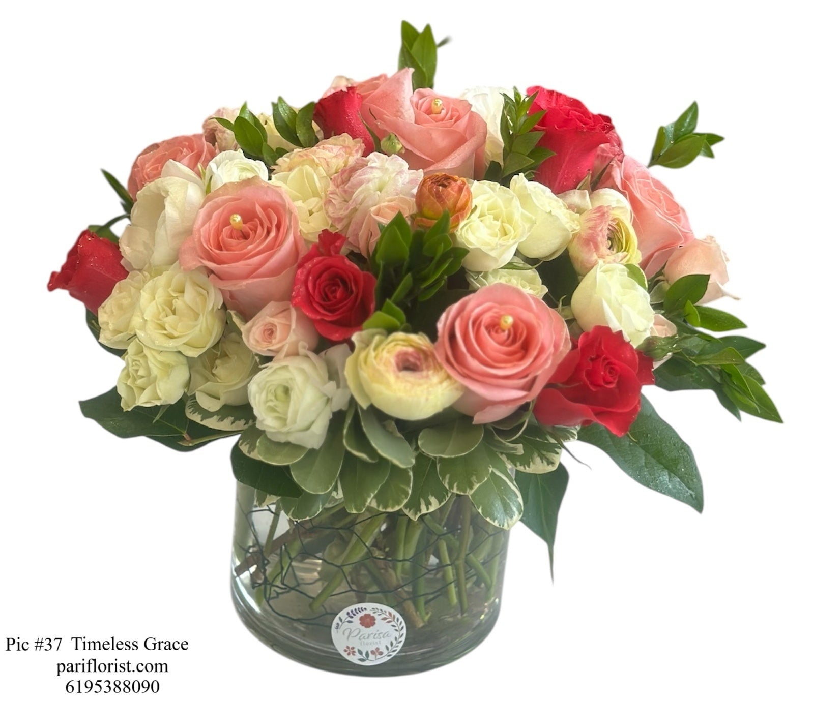 A graceful blend of soft blush, creamy ivory, and vibrant red roses arranged in a clear glass vase, Blushing Elegance is the perfect expression of love and sophistication. Lush greenery enhances the natural charm of this design, making it ideal for anniversaries, romantic surprises, or simply celebrating someone special.