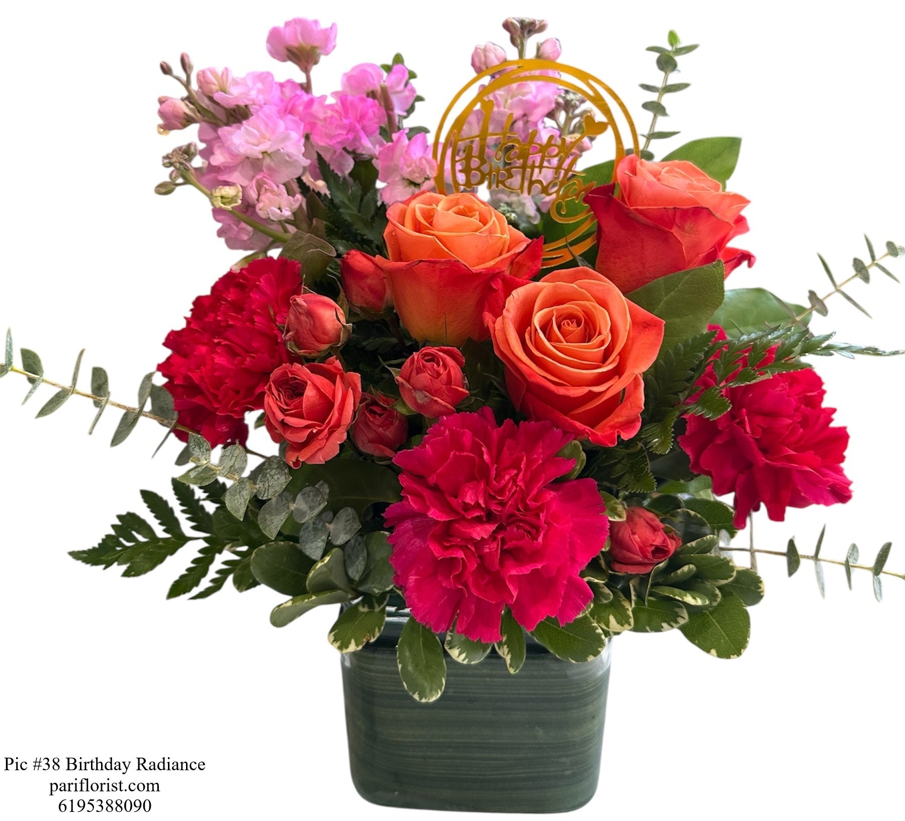 Celebrate in style with our Birthday Radiance arrangement! Bursting with fiery orange roses, bold red carnations, and delicate pink stock, this cheerful design is accented with fresh greenery and a festive Happy Birthday pick. Perfect for brightening someone’s special day with vibrant color and joy.