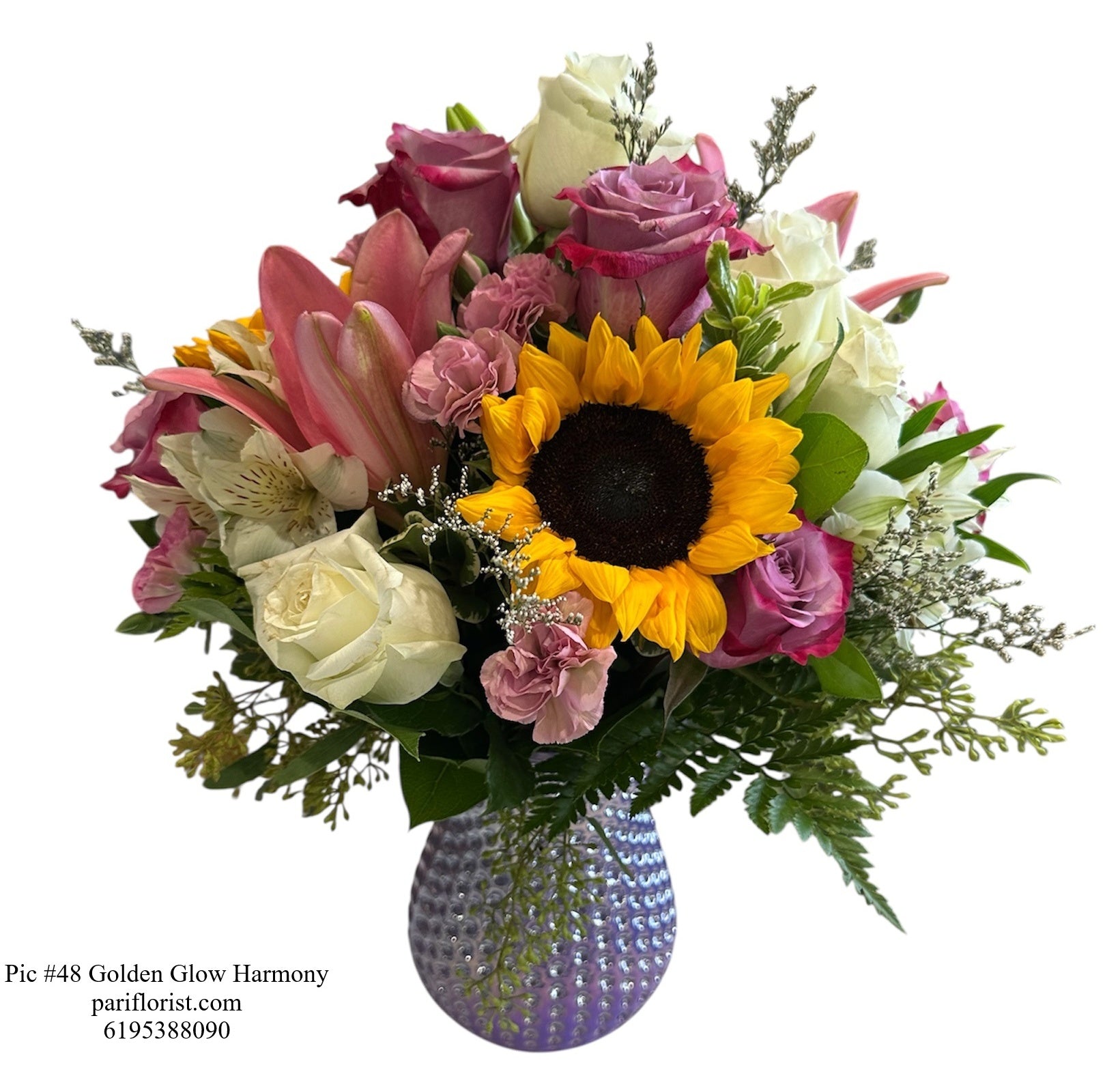 Bright and cheerful, this radiant arrangement combines the warmth of sunflowers with the charm of pink roses, soft white roses, and elegant lilies. Accented with delicate greenery and arranged in a textured lavender vase, it’s a stunning blend of joy and sophistication. Perfect for birthdays, celebrations, or simply to brighten someone’s day with a burst of sunshine and love.