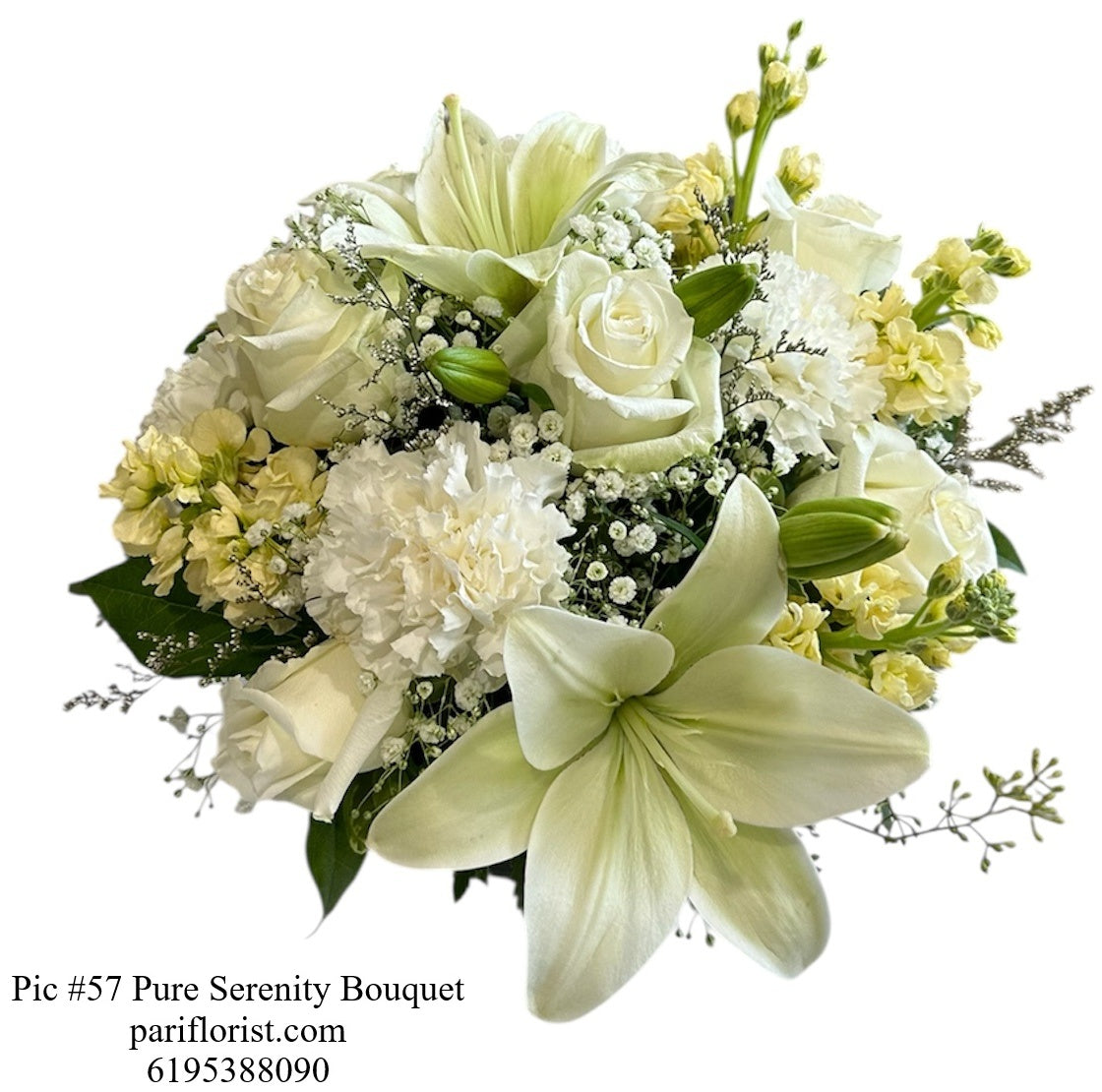 A soft and elegant arrangement featuring white lilies, creamy roses, and delicate hydrangeas, accented with gentle yellow stock and baby’s breath. Designed in a compact round style, this bouquet exudes purity and peace, making it a beautiful choice for sympathy, remembrance, or simply bringing a calming touch to any space.