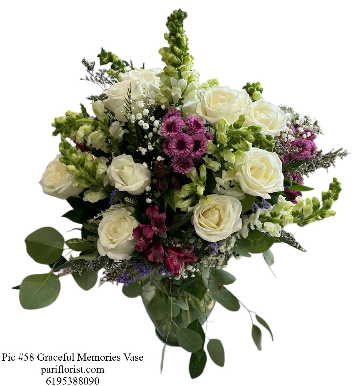 A timeless arrangement of pure white roses, carnations, and snapdragons accented with soft purple blooms and lush greenery. Designed in a classic glass vase, this elegant display conveys peace, comfort, and heartfelt sympathy, making it a beautiful tribute for memorials, services, or to express condolences at home.