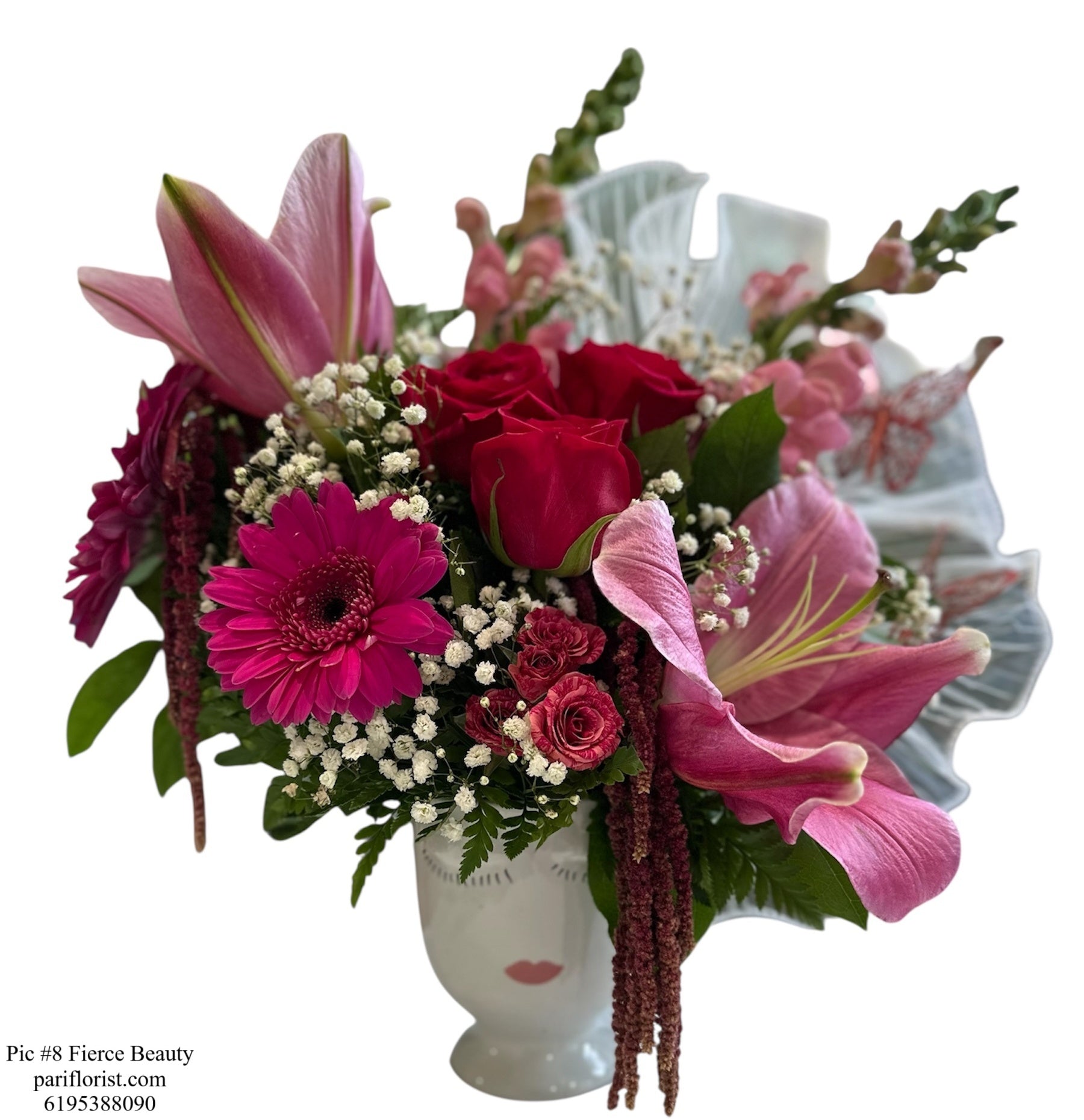 Make a statement with Fierce Beauty, a modern arrangement bursting with personality and charm. Featuring vibrant hot pink lilies, roses, and gerbera daisies accented with baby’s breath and textured greenery, this bouquet is designed in a chic face-shaped vase that adds a touch of artistry and whimsy. Perfect for birthdays, celebrations, or as a gift to someone with a bold, unforgettable spirit.