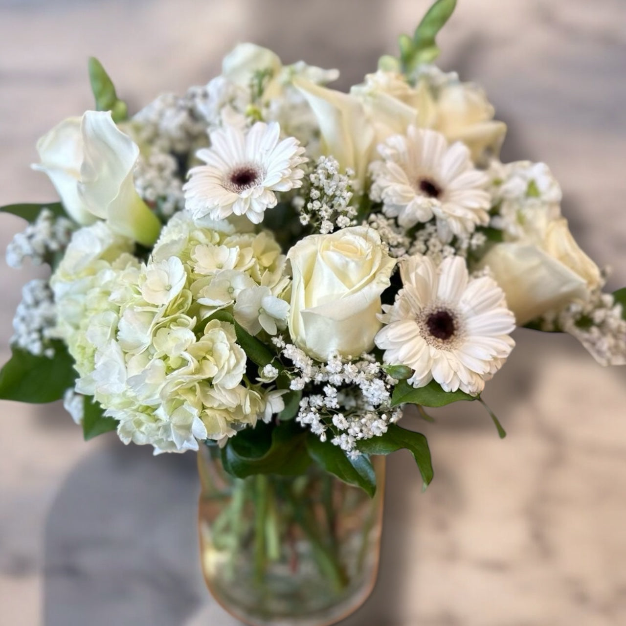 A luxurious bouquet of white roses, hydrangeas, and daisy-like blooms, exuding an air of purity and sophistication in a classic glass vase.
